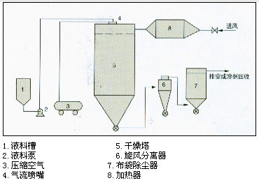 潔凈空氣加熱后進入干燥塔,在塔內熱風中用二流體(或三流體)噴嘴將各種料液物化成微小液滴,與熱風進行快速熱交換,蒸發掉液料中的水分(或溶劑),并隨熱風排出,得到粉狀產品。